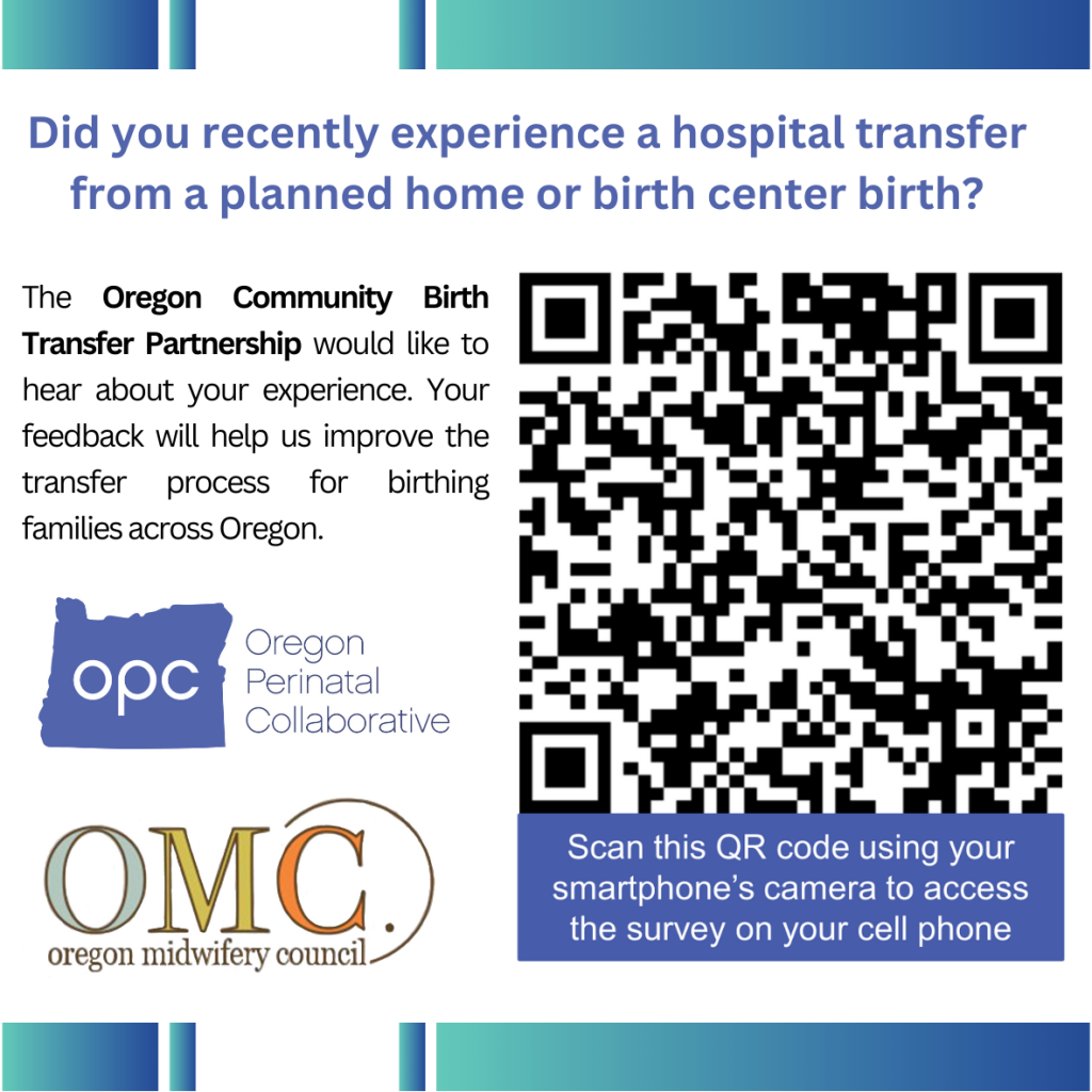 The Oregon Midwifery Council and the Oregon Perinatal Collaborative work together to improve home birth and birth center to hospital transfers across Oregon through the Community Birth Transfer Partnership. This statewide improvement initiative was founded in 2021 and is open to all birthing hospitals, community midwives, and EMS services in the state.